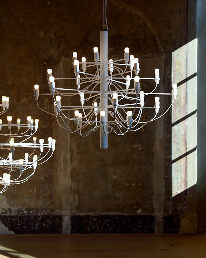 En av de mest kjente designene fra Flos er 2097-chandelieret, laget av Gino Sarfatti. Først lansert i 1958, har dette designet blitt et kjennetegn for moderne belysning. Med sin slanke, industrielle struktur og varme, stemningsfulle glød, forblir 2097 et tidløst mesterverk, tilgjengelig i flere finish som krom og messing.