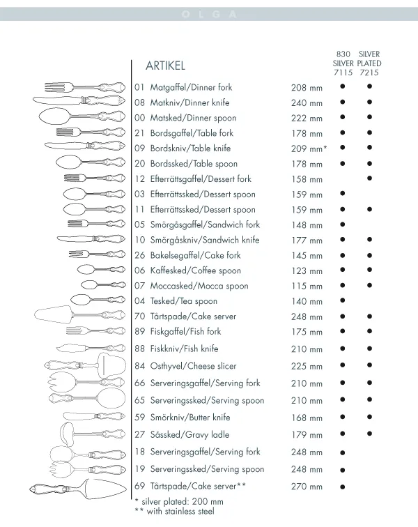 Den romantiske Olga-matskjeen i nysølv fra Gense er en klassisk serie som har vært veldig populær helt siden 1800-tallet. Olga har et vakkert design med bølgende, herlige linjer som er typiske for nyrokokko-æraen. Et nysølvsmatskje fra Gense er en god investering. Det er håndlaget av kvalitetssølv og vil aldri bli umoderne. Og ikke gjem det bort i en kommodeskuff - nysølv blir bare finere når det bruks ofte og kan utmerket godt kjøres i oppvaskmaskinen!