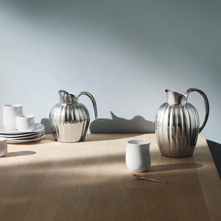 Bernadotte termokanne pushlokk fra Georg Jensen forener tidløs eleganse med gjennomtenkt funksjon. Inspirasjonen kommer fra Prins Sigvard Bernadottes klassiske formspråk, der tydelig funksjonalisme møter myke riflede linjer. Termokannen rommer 0,8 liter og holder drikken varm i opptil seks timer. Den er laget i rustfritt stål med krombelagt lokk og håndtak, og har en uknusbart innerbeholder med belegg som motvirker smitte av smak. Bernadotte termokanne pushlokk fra Georg Jensen er like selvfølgelig på frokostbordet som i stille stunder hjemme – en kombinasjon av skandinavisk design, kvalitet og funksjon i sin mest klassiske form.