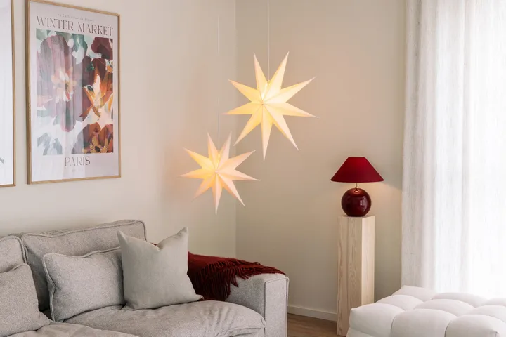 Iris 35 bordlampe 39 cm fra Globen Lighting, designet av Erika Norén, er en sjarmerende interiørdetalj. Lampen har en kuleformet fot i gjennomfarget glass med innblåste bobler og en matchende bomullsskjerm. Iris passer perfekt på et sidebord, en kommode eller i et dypere vindu, og gir et glad lys som lyser opp rommet.
