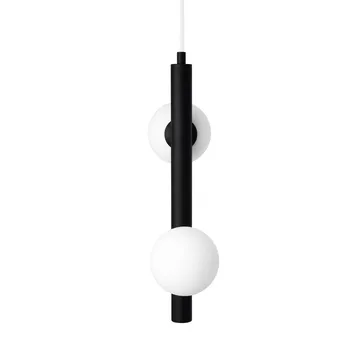 Pearl 1 pendel fra Globen Lighting er en elegant taklampe med matthvite glasskåler som ligner perler, montert på en matt svart pulverlakkert metallstamme. Den enkle konstruksjonen gjør glasskålerne lettmonterte etter at lyskilden er på plass. Plasser en enkelt lampe i et vindu for mykt, innbydende lys eller kombiner flere i en klynge over kjøkkenøya eller ved nattbordet for personlig stemning. En tidløs detalj som løfter rommet og gjør belysningen både funksjonell og dekorativ.