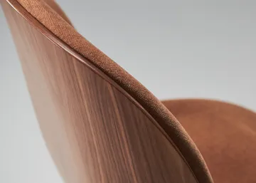 Beetle forsidekledd stol valnøtt fra Gubi er designet av designduoen GamFratesi. Denne varianten av den populære Beetle-stolen har et skall av valnøttfinér kombinert med et polstret sete og et slankt metallunderstell. Den billeinspirerte spisestolen har et elegant og moderne uttrykk som passer godt inn i den skandinaviske innredningsstilen.