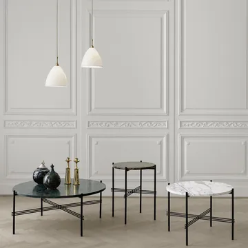 På det vakre TS-bordet fra danske Gubi kommer toppskiven i stort fokus. Velg mellom eksklusiv marmor eller dekorativt farget glass. TS-serien er designet av GamFratesi som har kombinert stilig dansk design med pompøs italiensk design. Møblene i Gubis sortiment følger ordene tidløshet, estetikk, innovasjon og funksjonalitet, som som speiler TS-serien. Kombinasjonen mellom toppskiven og de messingbelagte beina gir et utrolig luksuriøst utseende.