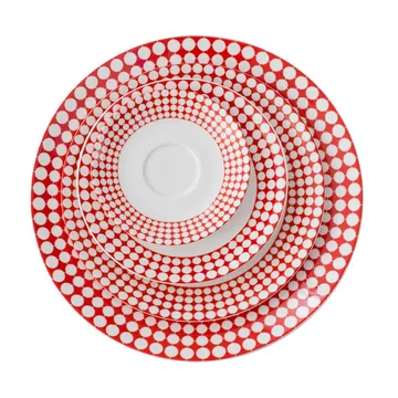 Skap en fargesterk og herlig retro borddekking med Eva tallerken fra svenske Gustavsbergs Porslinsfabrik, designet av Stig Lindberg. Eva-serien ble lansert for første gang i 1959 og ble i 2008 tatt opp igjen i produksjon til mange retroentusiasters glede. Eva-serien består av flere deler som alle er laget for hånd i benporselen med solid dekor i de karakteristiske fargene rødt og hvitt. Tallerkenen passer perfekt både til hverdags og fest og blir kjempefin i kombinasjon med Adam-serien som har samme mønster! Velg mellom ulike størrelser.