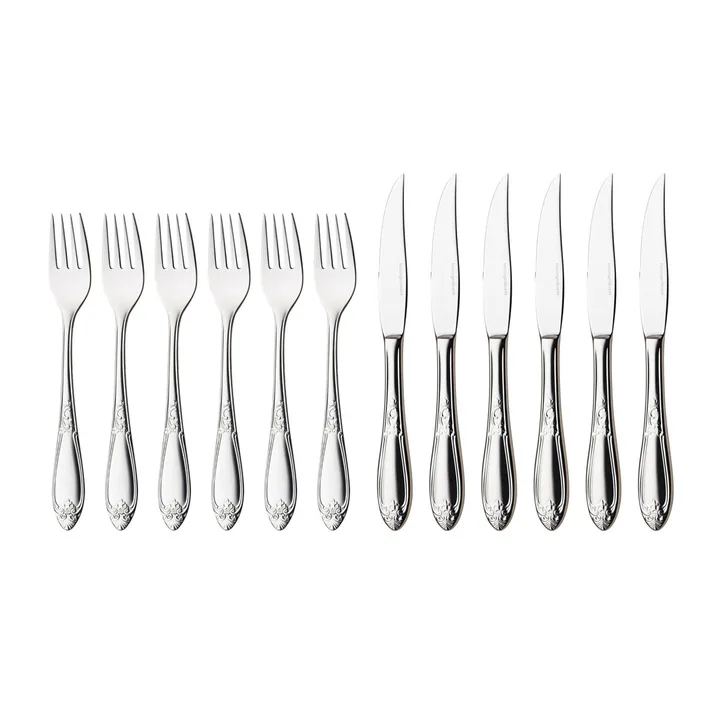 Nina er et vakkert og populært bestikk som består av spisebestikk og serveringsbestikk. I tillegg til biffbestikk og teskje, finner du også dessertbestikk, kakespader og salatbestikk. Nina er derfor et godt valg om du ønsker å ha alt bestikk til bordet i samme stil.