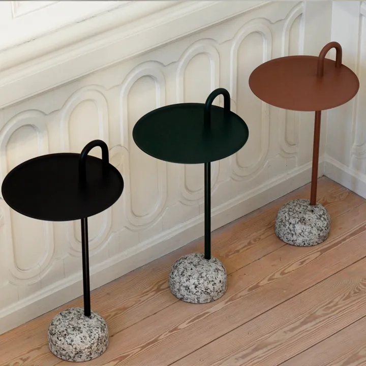 Bowler sidebord fra HAY er perfekt for små rom. Bordet har et stålrør som strekker seg oppover og fungerer som et praktisk håndtak. Produsert av pulverlakkert stål, tilbyr det en slitesterk overflate, mens den stabile granittbasen gir trygg tyngde. Denne kombinasjonen gir bordet balanse uten å gjøre det uhåndterlig. Bowler leveres umontert for enkel transport og håndtering.