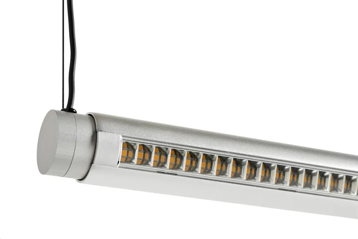 Factor Linear Suspension taklampe 1500 Directional fra danske HAY er en rørformet lampe som kan justeres 360 grader, noe som gjør at du kan velge om du vil bruke den med direkte eller indirekte lys. Dimitri Bähler har designet den dimbare lampen som takket være det fokuserte lyset passer perfekt på kontoret.