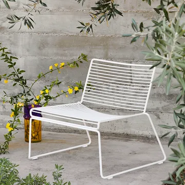 Hee loungestol fra HAY, designet av Hee Welling, er en del av Hee-serien. Laget av galvanisert metalltråd, noe som gjør den rustbestandig og holdbar for utendørs bruk. Den er også stablbar, noe som gjør den utmerket for uterom som restauranter og barer. Til tross for sin robusthet gir den et luftig inntrykk og blir et vakkert innslag i hjemmet for en komfortabel loungefølelse.