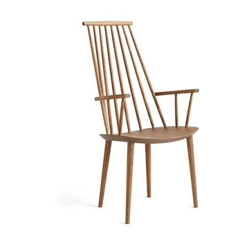 J110 karmstol fra HAY er skapt av Poul M. Volther. Stolens høye trestaver i ryggen skaper en fascinerende effekt av skyggespill når solen skinner. Perfekt for både spiseplass og stue, tilbyr dette tidløse designet komfort og estetikk i ett.