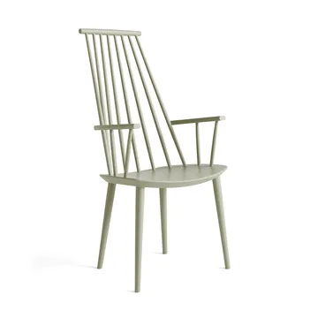 J110 karmstol fra HAY er skapt av Poul M. Volther. Stolens høye trestaver i ryggen skaper en fascinerende effekt av skyggespill når solen skinner. Perfekt for både spiseplass og stue, tilbyr dette tidløse designet komfort og estetikk i ett.