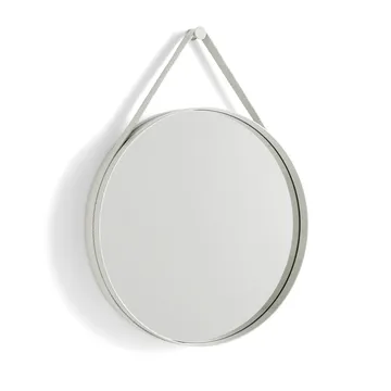 Strap Mirror speil Ø50 cm fra danske HAY er et rundt speil med feste på baksiden. Rammen er laget i pulverlakkert stål med et spor rundt kanten hvor du kan feste det medfølgende gummibåndet som brukes som dekorasjon. Speilet passer godt i gangen eller på soverommet, men er ikke egnet for våtrom.