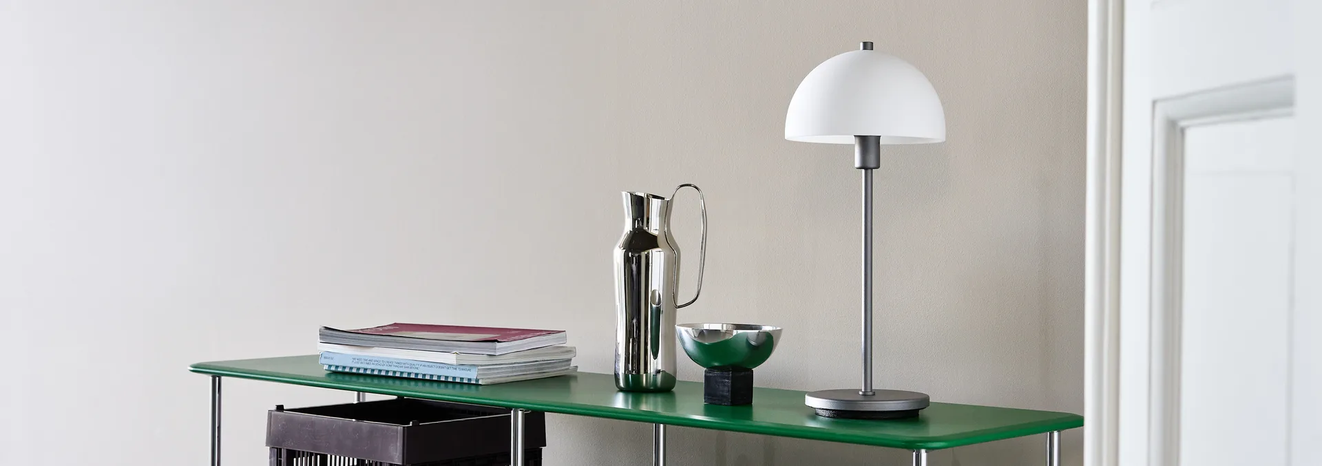 Vienda X bordlampe fra danske Herstal er en videreutvikling av den klassiske Vienda. Det nye med denne modellen er at den har en mer elegant form, samt at den har en oksidert stålfot med matt finish og skjerm av opalglass. Bordlampen egner seg utmerket i vinduskarmen, på nattbordet eller på komoden din.