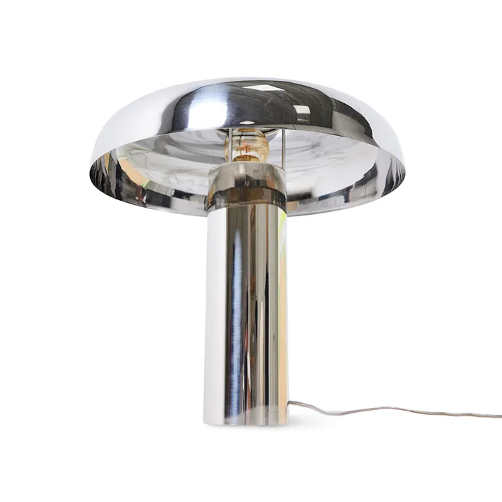 HK Living mushroom bordlampe fra HK Living er en lampe laget av rustfritt stål med en minimalistisk skandinavisk design i form av en avlang sylinderformet fot og en mykt formet lampeskjerm. Plasser bordlampen for eksempel i vinduet eller på et sidebord og la lampens skinn bre seg i rommet.