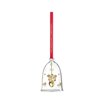 Holmegaard Christmas årets juleklokke er en vakker julepynt formet som en klokke i glass, designet av Ann-Sofi Romme. Dekorasjonene på glassklokken består av et gullfarget snøfnugg omgitt av små røde hjerter. Til juleklokken følger det også med et vakkert rødt bånd for å henge klokken i juletreet eller i vinduet.