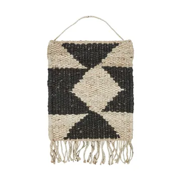 Murro veggdekorasjon 35x50 cm fra House Doctor forgyller hjemmet ditt med håndlaget sjarm. Laget av naturjute har den et grafisk mønster i svart og naturtoner. En skjult trelist i mangotre gir støtte mens dekorative frynser tilfører tekstur. Siden veggteppe er håndlaget kan variasjoner i farge, form og størrelse forekomme.