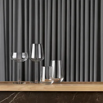Drikkeglass fra Iittalas tidløse serie Essence. Glassene er laget i Finland av munnblåst glass med klassisk design signert Alfredo Häberli. Den stilrene formen gjør glassene perfekte å dekke på med, både til hverdags og fest.
