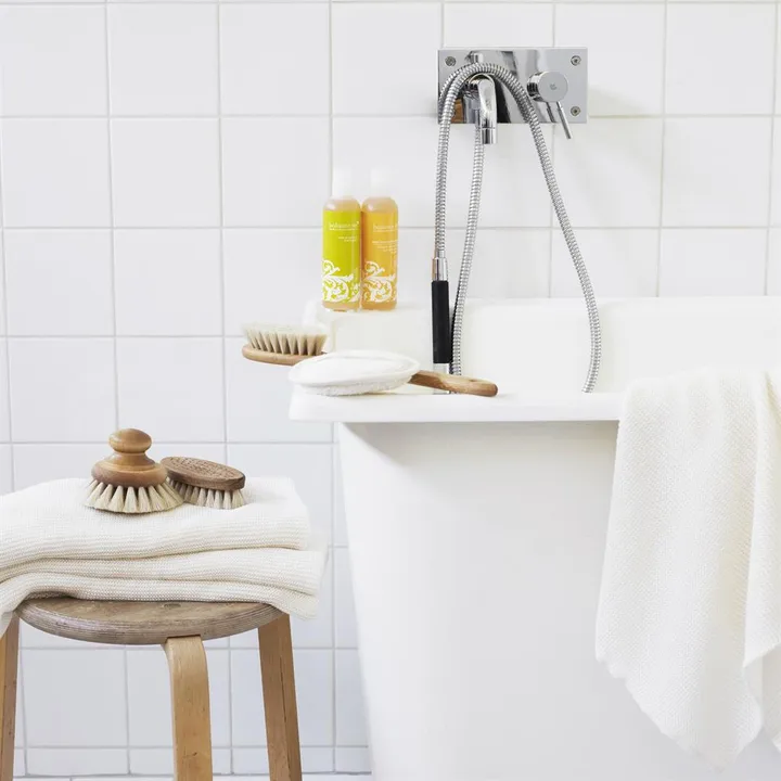 Iris Hantverk Badebørste med skaft fra Iris Hantverk er en klassisk badebørste med børstehår av tagel og et håndtak i eik som gjør det enkelt å nå over hele kroppen. Tagelens naturlige føyelighet gir et behagelig skum sammen med såpe og rengjør skånsomt samtidig som materialet er slitesterkt. Det hule taglet transporterer fukt effektivt — rist av overflødig vann og la børsten tørke hengende eller stående på børstelaget for best holdbarhet. En tidløs og funksjonell detalj på baderommet som gjør dusjrutinen både behagelig og effektiv.
