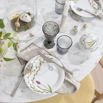 Asjett med påskemotiv fra serien Hammershøi Easter, utviklet av Kähler med illustrasjon av Rikke Jacobsen. Asjetten har samme riflede overflate som den klassiske Hammershøi-serien, men med et vakkert påskemotiv som fanger den spesielle vårfølelsen. Kompletter gjerne med øvrige deler i Hammershøi Easter-kolleksjonen. Hver del av serviset har et frittstående motiv, men med et felles uttrykk, noe som skaper en levende oppdekking. Den vakre grenen som holder på å springe ut, er et tilbakevendende innslag i årets påskekolleksjon sammen med de typiske symbolene for påske i form av egg, kyllinger og fjær.