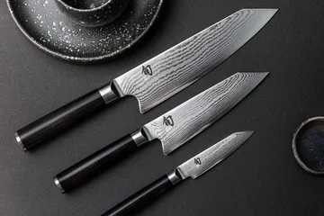 Kai Kiritsuke kniv fra KAI Shun Classic. Laget av VG MAX-stål med en hardhet på 61 (±1) HRC. Bladet har 32 lag damaskusstål, noe som gir eksepsjonell holdbarhet og fleksibilitet. Skaftet av pakkatre er utformet i tradisjonell japansk kastanjeform, forsterket med høykvalitets harpikser for fuktmotstand. En liten kant på høyre side sikrer et sikkert grep. Den integrerte tangen forbedrer stabilitet og balanse.