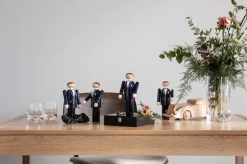 Kay Bojesen brudgom fra Kay Bojesen Denmark er en liten, sjarmerende kakefigur designet av Kay Bojesen som blir et minneverdig innslag på bryllupsdagen. Inspirert av arkivets originaldesign er brudgommen laget i FSC®-sertifisert bøk med håndmalte detaljer og nøye utførte knapper, lommetørkle og slag som gir jakken liv. Hans glade smil og klassiske uttrykk gjør ham naturlig på både enkel og svært pyntet kake. Figuren er 12 cm og selges separat — kombiner med andre figurer eller velg til en diskret magnetplate for ekstra stabilitet.