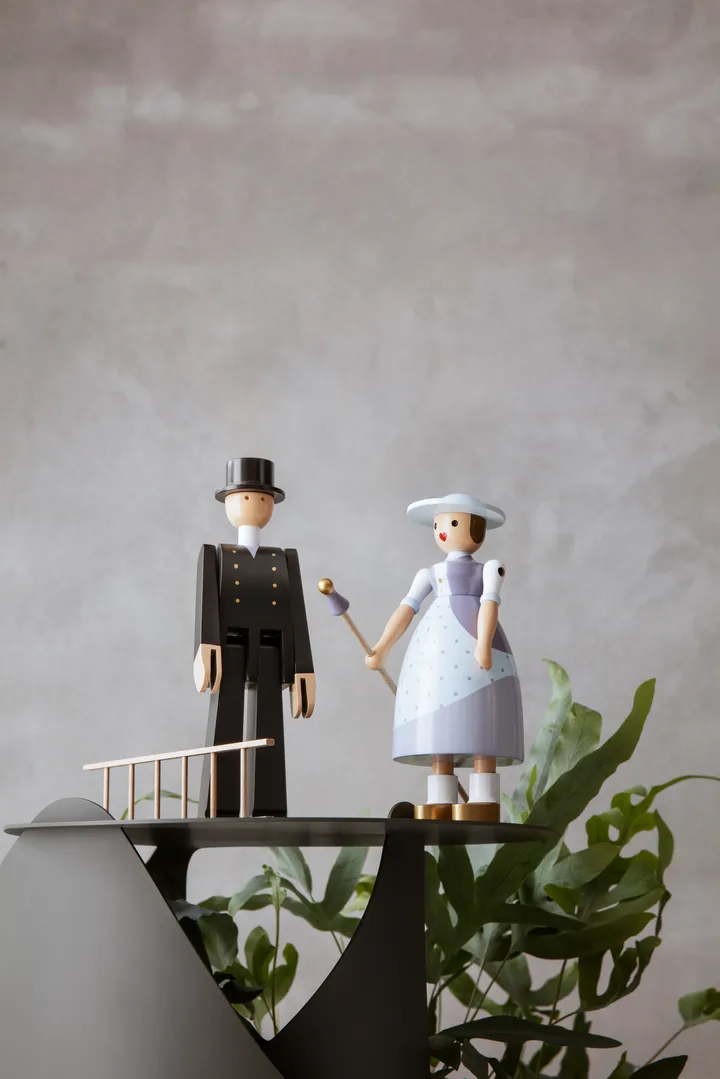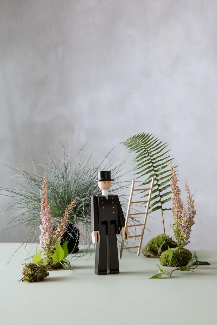 Kay Bojesen feier fra Kay Bojesen Denmark er en tidløs trefigur fra Figurines-kolleksjonen, formgitt av Kay Bojesen. Laget i FSC‑sertifisert bøk og håndmalt med omhu, fanger feieren lekenhet og varme med sine blanke knapper, hvite skjerf og ikoniske sylinderhatt. Den rette, stolte holdningen gir en fortellende karakter som vekker fantasi — perfekt på en hylle, i et vindu eller som gav til noen som setter pris på håndverk og design med sjel. En sjarmerende detalj som skaper glede i hjemmet.