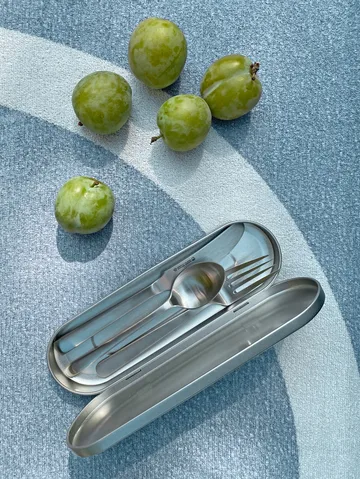 Grand Prix bestikksett reisesett 3 deler fra Kay Bojesen inkluderer en kniv, gaffel og skje laget i rustfritt stål. Kay Bojesens Grand Prix-bestikk vant førstepris ved Triennale di Milano 1951. Som funksjonalist hadde Kay Bojesen en visjon om å skape en serie funksjonelle og estetiske redskaper, designet uten unødvendige detaljer og kun med de nødvendige konturene for perfekt funksjonalitet. Sett leveres i et praktisk reiseetui i rustfritt stål for enkel bestikkoppbevaring.