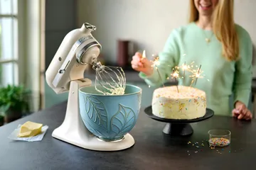 KitchenAid keramikkbolle uten håndtak 4,7 L er laget av slitesterk titanforsterket keramikk som tåler både ovn, fryser og mikrobølgeovn. Med en kapasitet på 4,7 liter passer den perfekt til både små og store oppskrifter, og etter bruk rengjøres den enkelt i oppvaskmaskin. Oppdag de mange ulike designene på KitchenAids boller og bland fritt for å finne personlige og lekne kombinasjoner som passer perfekt på ditt kjøkken. Passer til KitchenAids mellomstore kjøkkenmaskiner med vippbart drivhode (volum 4,3-4,8 liter).