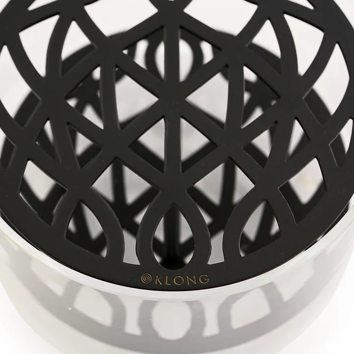 Äng vase, liten fra KLONG er en elegant vase i munnblåst glass designet av Eva Schildt. Den karakteristiske utskårne metallstativet fungerer som en innebygd blomsterstøtte og gir hvert arrangement stabilitet og fin struktur. Metallmønsteret er håndlaget, noe som gjør hver vase unik med små variasjoner i detaljarbeidet. Vasen kombinerer følelse og funksjon — perfekt for buketter eller enkeltkvister hjemme.