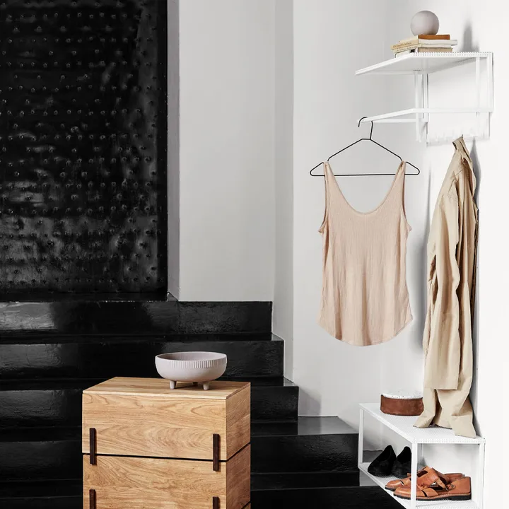 Grid hattehylle fra Kristina Dam Studio tilbyr en funksjonell og estetisk løsning for oppbevaring av ytterklærne dine. Dens perforerte stålplate gir plass til hatter, paraplyer eller til og med kunstverk. Denne hyllen er ideell for å maksimere oppbevaringsplassen uten å gå på kompromiss med designen. Skap en elegant entré med denne smarte og praktiske hattehyllen.