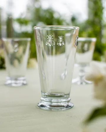 Abeille drinkglass 46 cl 6-pakning fra La Rochère er et vakkert sett med seks robuste glass prydet av La Rochères karakteristiske bie. Formgitt for hverdag og fest, passer de like godt til kalde drikker som til servering ved middager eller på sommerbordet. Det holdbare franske glasset gir en tidløs følelse og tåler hyppig bruk, noe som gjør settet til et pålitelig valg for den som vil kombinere funksjon og sjarm på kjøkkenet. Et stilfullt tilskudd som løfter dukningen.