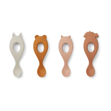 Livia skje 4 deler fra Liewood er laget i en kombinasjon av silikon og nylon. Disse silikonskjeene er perfekte for barn som skal begynne å spise selv – med gripevennlig håndtak og små markeringer som gjør det lettere å holde skjeen. Fargerike detaljer og LIEWOOD-dyr gjør måltidene både morsomme og funksjonelle.