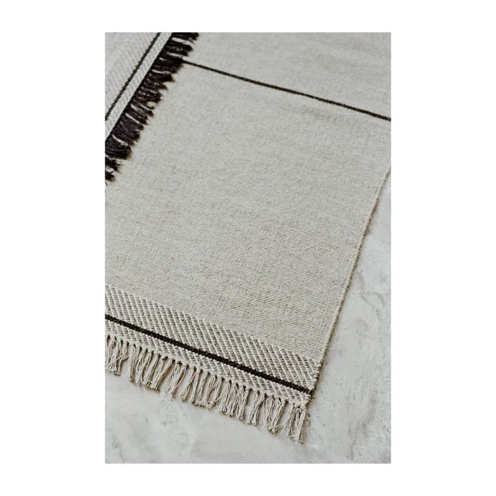 Mindful Soul ullteppe 200 x 300 cm fra danske Linie Design er et håndlaget teppe vevd av OEKO-TEX-sertifisert ull. Det lille teppet har et grafisk tofarget design med frynser på kortsidene. Plasser det stripete teppet under sengen på soverommet eller under sofagruppen i stuen.