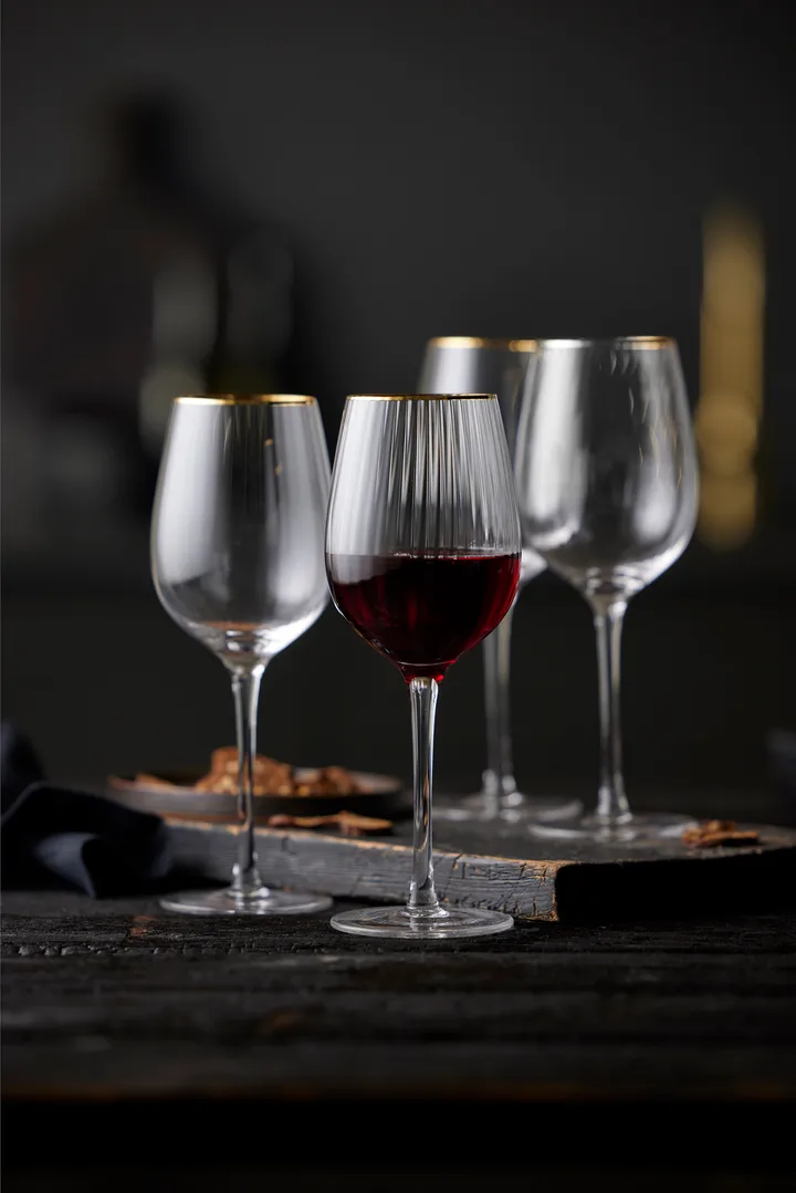 Palermo Gold rødvinsglass 40 cl 4-pakning fra danske Lyngby Glas er laget i glass av høy kvalitet med et eksklusivt og stilfullt design. Disse vinglassene er perfekte for å nyte din favoritt rødvin på beste måte. Med sin generøse volum på 40 cl rommer de nok vin til at du kan nyte vinen uten avbrudd. La disse elegante Palermo Gold rødvinsglassene forskjønne vinopplevelsene dine og gi et ekstra preg av luksus til borddekkingen.