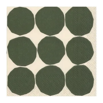 Papirserviett med Marimekko-mønsteret Kivet, som ble tegnet av Maija Isola 1956. Formgiveren skapte mønsteret ved å klippe ut sirkler av papir, noe som har gitt mønsteret Kivet det litt rustikke utseendet. Inspirasjonen til formene skal ha kommet fra de store steinene som ble gravd opp for å lage plass til Maija Isolas studio. En pakke inneholder 20 servietter som er lagd av FSC-sertifisert papir.