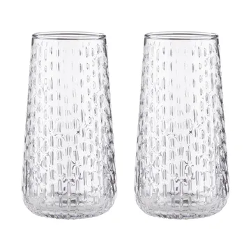 Syksy long tumbler glass 2-pack fra Marimekko er to elegante drikkeglass i glass, designet av Matti Klenell. Den avlange formen gir en moderne og innbydende følelse som løfter borddekningen enten du serverer vann til frokosten eller drinker om kvelden. Perfekt for deg som ønsker en kunstnerisk og funksjonell detalj på bordet.