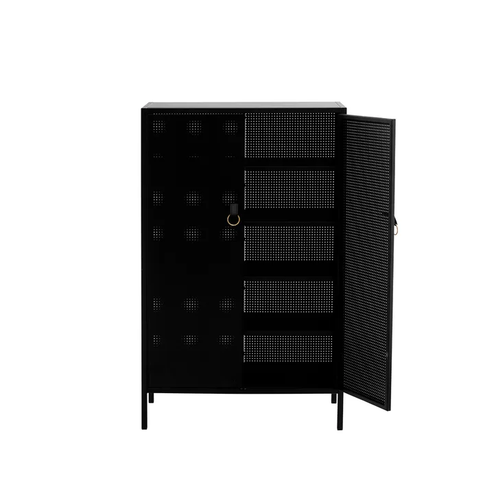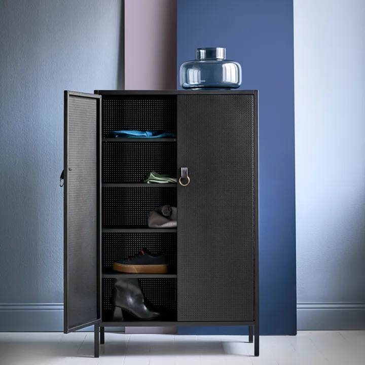 Francis skap fra Maze er en elegant del av Maze Interiors Pieces-kolleksjonen. Håndlaget i Småland, består det av perforert metall, tre og lærdetaljer. Skapets design gjør det allsidig og egnet for ulike rom. Med tre avtakbare hyller tilpasser det seg etter dine behov og kan enkelt romme alt fra støvler til sko.