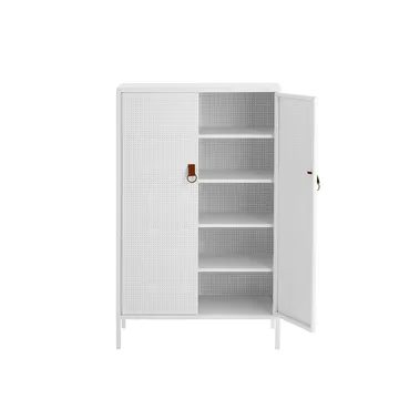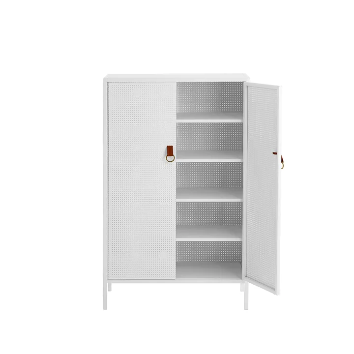 Francis skap fra Maze er en elegant del av Maze Interiors Pieces-kolleksjonen. Håndlaget i Småland, består det av perforert metall, tre og lærdetaljer. Skapets design gjør det allsidig og egnet for ulike rom. Med tre avtakbare hyller tilpasser det seg etter dine behov og kan enkelt romme alt fra støvler til sko.