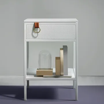 Tracy sidebord fra merket Maze er et vakkert bord med eksklusive detaljer som passer utmerket til en rekke formål. Bordet har en italiensk keramisk plate på toppen og en bunndel produsert i pulverlakkert metall som er håndsveiset i Sverige. Den perforerte platen i den øvre delen av bunnen skjuler en skuff, og den nederste hyllen egner seg godt for oppbevaring av for eksempel bøker eller aviser. Dette er den venstrestilte varianten, men Tracy finnes også som høyrestilt variant så de skal passe sammen ved siden av en seng. Bordet kan også brukes som sofabord, eller som et ekstra bord i for eksempel gangen. Velg mellom flere ulike varianter.