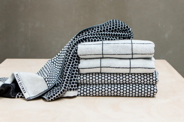 Tile Stone gjestehåndkle 38 x 60 cm 2-pakning fra danske Mette Ditmer er stilrene håndklær med tynne linjer som minner om gulvfliser. Gjestehåndklærenes grafiske design har en undertone av retro, og den OEKO-TEX-sertifiserte bomullen skaper en fantastisk myk følelse.