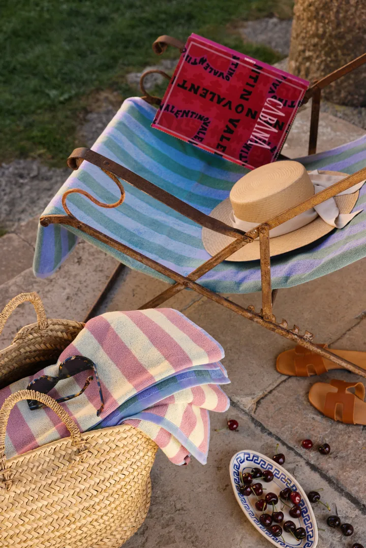 Positano strandhåndkle 100x180 cm fra Mille Notti er laget av ringspunnet bomull med en vekt på 450 g/m² og sertifisert i henhold til STANDARD 100 by OEKO-TEX®, noe som garanterer at materialet er trygt og skånsomt mot huden. Det stripete bomullshåndkleet har to sider med forskjellige fargekombinasjoner – rosa/gule striper på den ene siden og lysblå/grønne på den andre. En generøs størrelse gjør det perfekt for strand, basseng eller piknik.
