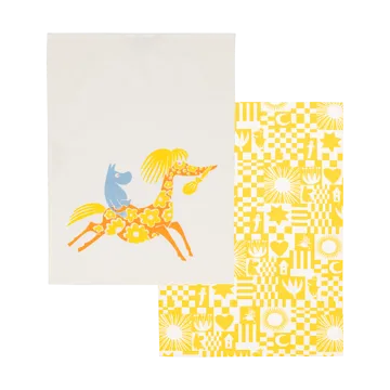 Mummi kjøkkenhåndkle Fest 50x70 cm, 2 deler fra Moomin Arabia er laget av 100 % økologisk bomull og gir kjøkkenet ditt en sommerlig og leken følelse. De fargerike mummimønstrene, inspirert av Tove Janssons design fra 1950-tallet, gjør matlagingen litt morsommere. Kjøkkenhåndklærne kombinerer kvalitet med bærekraft og blir en sjarmerende detalj i kjøkkeninnredningen din.
