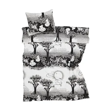 Mummitrollet sengesett 150 x 210 cm fra Moomin Arabia er et sengesett med dynetrekk og putetrekk produsert i økologisk bomull. Skap skjønnhet på soverommet og sov godt i myke laken prydet med motiver fra Mummitrollenes magiske verden.