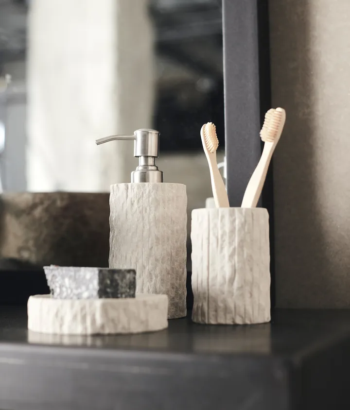 Kama såpepumpe fra MUUBS er laget av sandstein og gir badet en rå eleganse med en unik og karakterfull overflate. Kama-serien inviterer til en stilren og personlig atmosfære, inspirert av organiske former og sjarmerende detaljer. Navnet Kama, hentet fra den indiske kjærlighetsguden, hyller det ufullkomne og egenkjærligheten. Den vakre såpepumpen, designet med en funksjonell pumpe, passer like godt på kjøkkenet som på badet.
