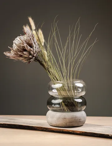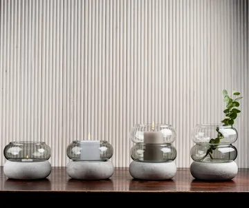 Bagel vase/lyslykt 22 cm er en moderne klassiker fra finske Muurla, designet av Kata Nowak-Kiminki. De tre runde delene av glass og betong kan plukkes fra hverandre og kombineres på flere forskjellige måter for å passe til så vel små og store lys som vakre blomsterarrangementer. Bagel fungerer dermed som en hybrid mellom en lyslykt og en vase og blir raskt en allsidig favoritt i hjemmet.