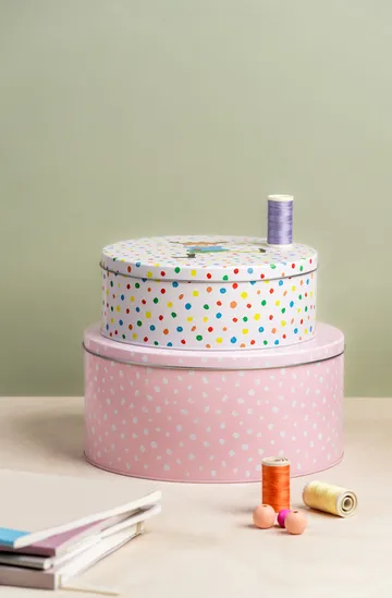 Pippi boksesett fra Muurla er laget av blikk og designet av Kata Nowak-Kiminki. Sett består av to runde bokser, en med det fargerike Hoppsansa-motivet og en med den sjarmerende rosa Pippi og Hesten-illustrasjonen. Perfekt for å organisere småting og skatter på barnerommet eller på skrivebordet, eller hvorfor ikke bruke som kakebokser?
