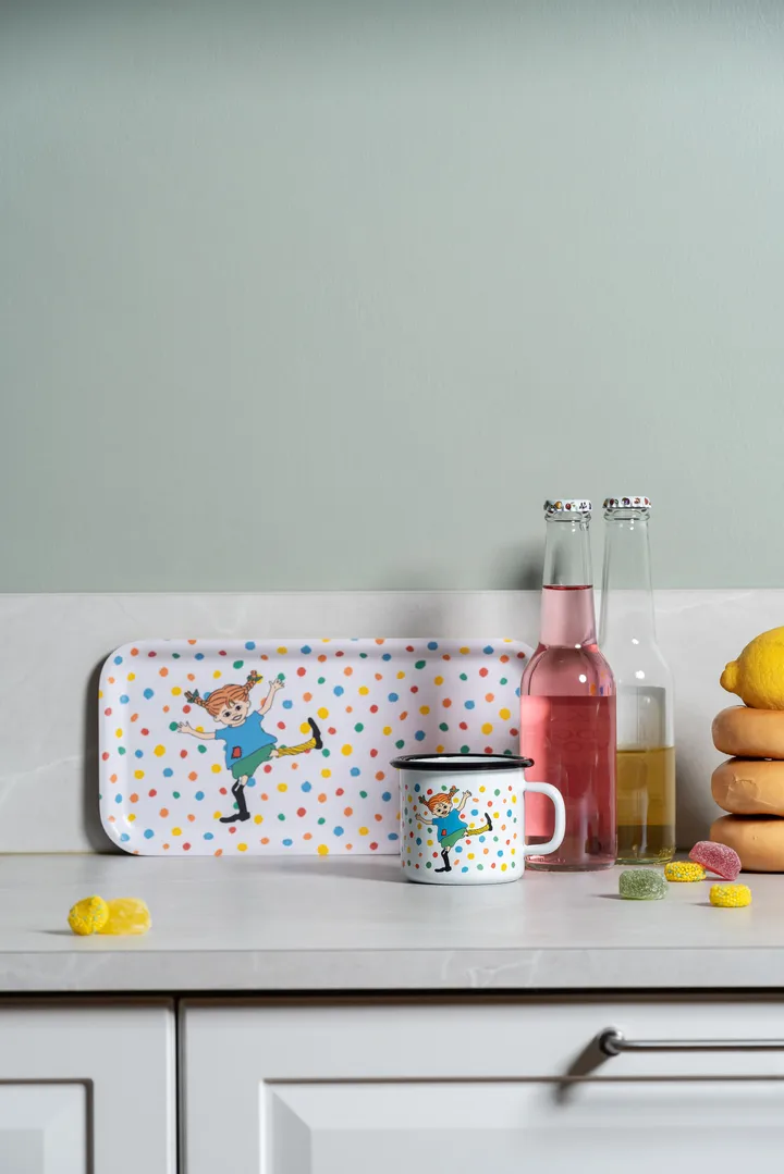 Pippi emaljekrus 2,5 dl fra Muurla er laget av kullstål med en finish av emalje og et motiv designet av Kata Nowak-Kiminki. Dette kruset er dekorert med fargerike prikker i Hoppsansa-designen, som passer perfekt for Pippi Langstrømpe. Kruset er både holdbart og lett, noe som gjør det ideelt for både innendørs og utendørs bruk.