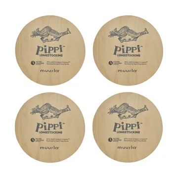 Pippi glassunderlag 4 deler fra Muurla er laget av bjørkefinér og metall med motiver designet av Kata Nowak-Kiminki. Disse fargerike underlagene prydes av Pippis hest, hennes ape Herr Nilsson, naboene Tommy og Annika samt Pippi selv. Oppbevares i en praktisk metalleske når de ikke er i bruk.