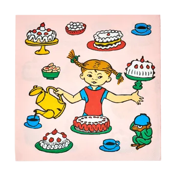Pippi servietter 33x33 cm 20-pakning fra Muurla er laget av 3-lags papir og dekorert med fargerike prikker i Hoppsansa-design, hvis mønster er designet av Kata Nowak-Kiminki. Disse serviettene med Pippi Langstrømpe-motiv skaper glede rundt bordet, enten det er bursdagsfest eller en annen sammenkomst.