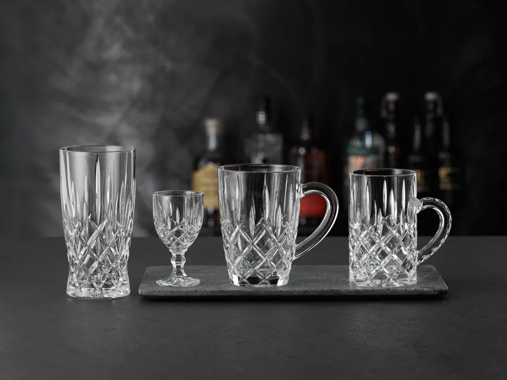 Noblesse drinkglass 35 cl 4-pakning fra Nachtmann er laget av vakkert krystallglass og er designet med et interessant rutemønster som kaster vakre reflekser når det treffes av lys. Glassene passer utmerket både til øl og til syrlige eller søte drinker, og blir et dekorativt innslag på både hverdagslige og festlige dekkede bord. Noblesse drinkglass passer takket være sin formgivning like godt som ølglass og kan gjerne kombineres med andre deler fra Noblesse-serien for en samlet følelse.