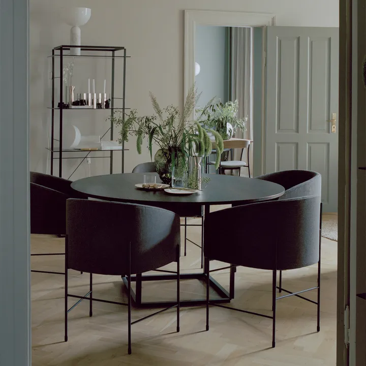 Florence spisebord rundt fra New Works, designet av Knut Bendik Humlevik, har et distinkt kvadratisk stålunderstell som maksimerer benplassen. Med sin elegante runde bordplate, tilgjengelig i tre eller marmor, skaper det en innbydende atmosfære for samtaler ved måltider. Det er en perfekt balanse mellom funksjonalitet og estetikk, noe som gjør det til et ideelt valg for både hverdagslige og formelle middager.